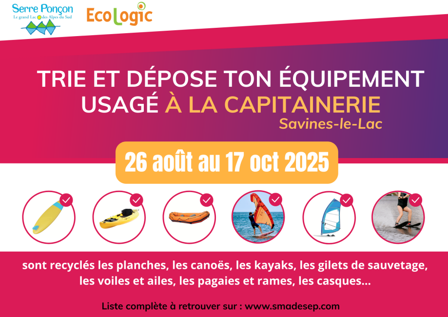 Le Syndicat Mixte d’Aménagement du Lac de Serre-Ponçon organise une collecte des articles nautiques usagés du 26 août au 17 octobre 2025.