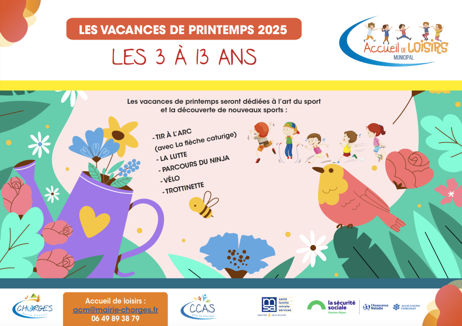 21 mars 2025 Familles & Solidarités Un nouveau programme est proposé pour les vacances de Printemps 2025.Il s'adresse à tous les enfants et les jeunes de 3/13 ans ! Vacances Printemps 2025Lire plus de publications sur Calaméo Documents Document Vacances Printemps 2025.pdf Infos pratiques Mairie de Chorges 04 92 50 60 30 Nous contacter A ne pas manquer Actualités Evénements