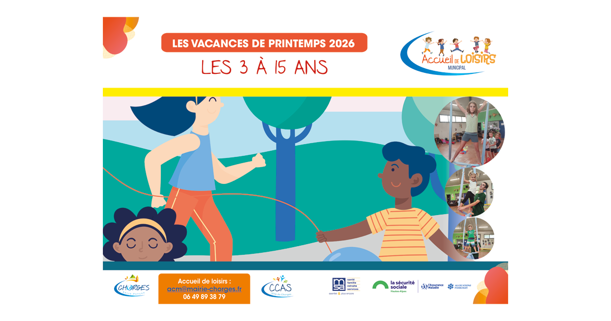 30 mars 2026 Familles & Solidarités Un nouveau programme est proposé pour les vacances de Printemps 2026.Il s'adresse à tous les enfants et les jeunes de 3/15 ans ! Vacances Printemps 2026Lire plus de publications sur Calaméo Documents Document Vacances Printemps 2025.pdf Infos pratiques Mairie de Chorges 04 92 50 60 30 Nous contacter A ne pas manquer Actualités Evénements